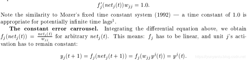 在实验中,利用恒等函数fj: fj (x) = x来保证;设置wjj = 1:0。我们称之为常误差卡鲁塞尔(CEC)。CEC将是LSTM的中心特性(参见第4节)。当然,