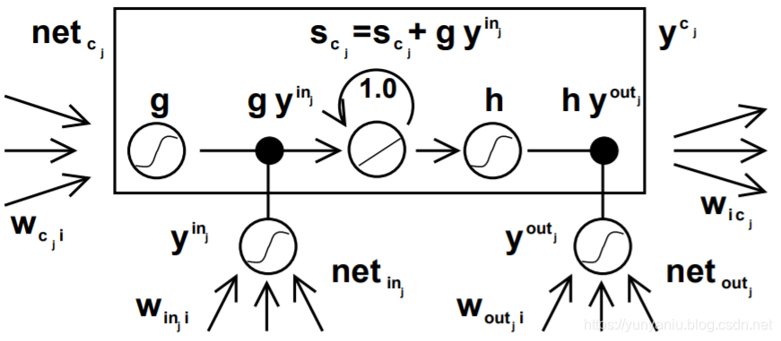 图1:memory cel l cj(盒子)的结构和它的门单元inj;outj。自循环连接(权值为1.0)表示反馈延迟1个时间步长。它建立了恒定误差carrousel”CEC”的基础。星门单元打开和关闭CEC的入口。详情见正文和附录A.1。