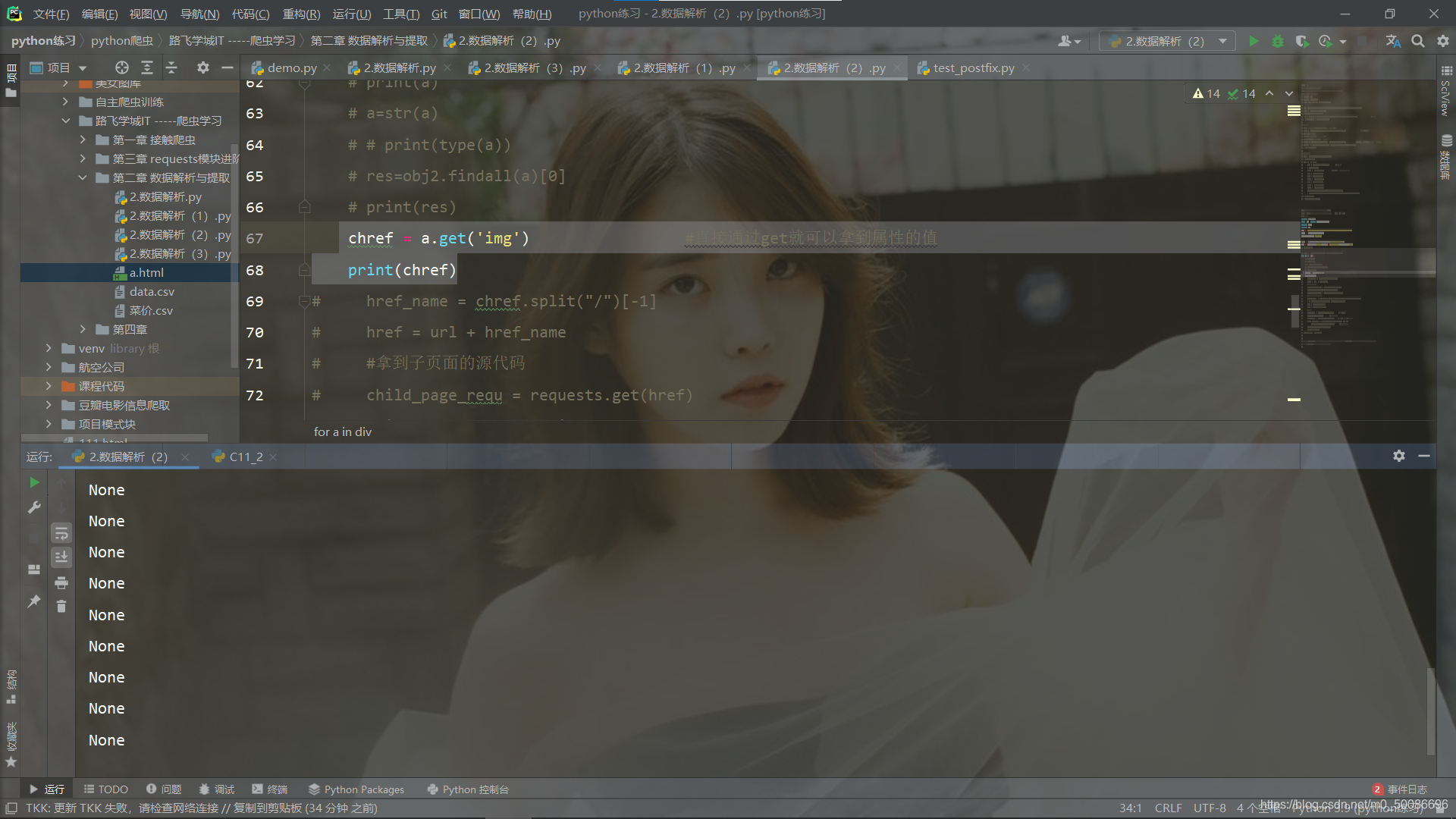 搞了很久才知道问题所在,因为我们的bs4解析,是根据标签中属性去进行提取其中的值,而img是在a标签里边的内容,我们可以定义href得到网址内容,也可以定义class得到内容,但是无法对标签里的内容进行提取,所以我们使用bs4提取的话,是需要先进入到网站的子网站中去,才能获取到图片的链接。