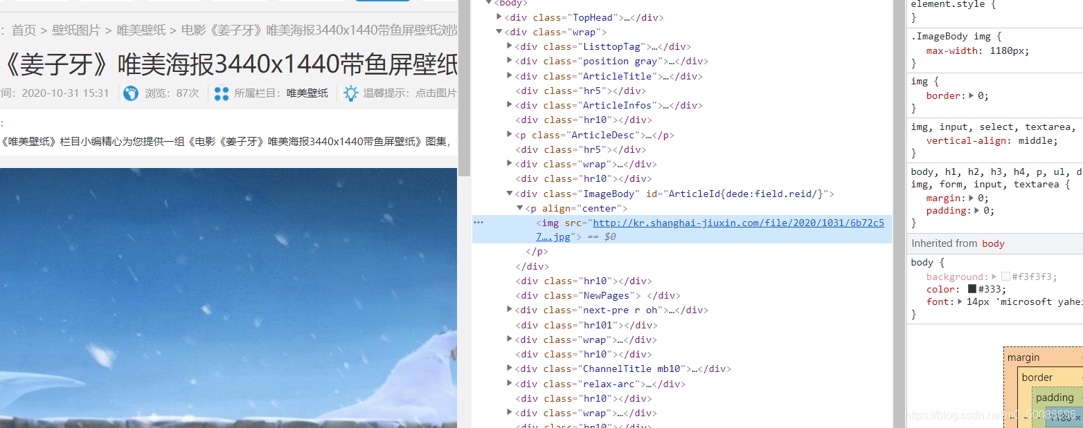 注意:我们通过观察源代码中图片和子网页中图片链接对比能发现在源代码中得到的图片只是缩略图,所以如果我们需要对图片清晰度有一定的要求的话,还是得进入到子网页中进行图片下载